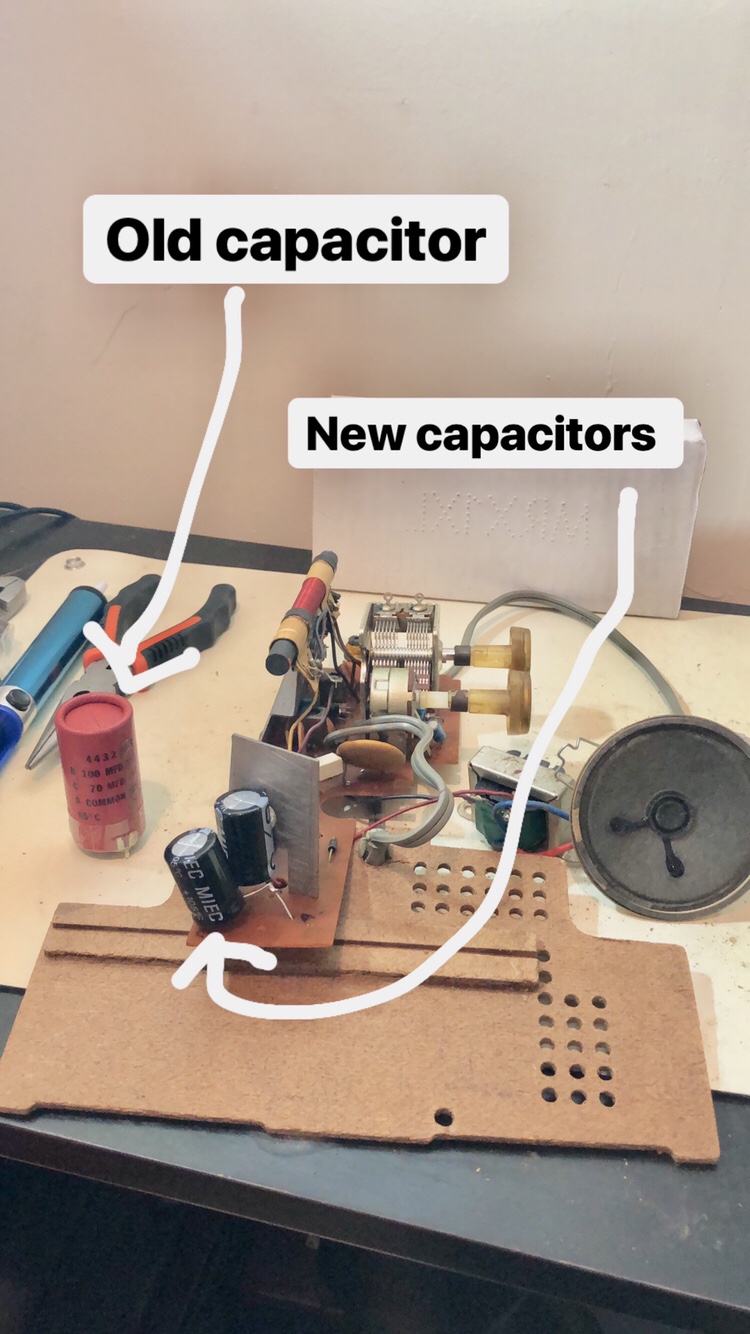 In the photo below you will see the faulty, old capacitor. The trickiest part was installing new capacitors that would allow for the chassis to properly fit back into the case due to the rather small size of the radio. I soldered the two negative leads together on the new capacitors which gave me the flexibility needed to put her all back together.