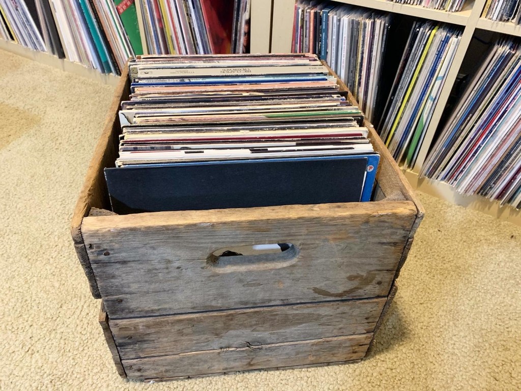 I like to take walks around the block in our neighborhood and in warmer weather I’m often wearing a shirt I made for myself that says, “I Will Buy Your Records”. My neighbor saw the shirt and brought a crate of records by the house for me to look through. I bought them all. “Good, he said, I have another crate to bring by.” Just as I was finishing listing the first crate of records for sale on Discogs, he showed up with the second crate of records photographed below.